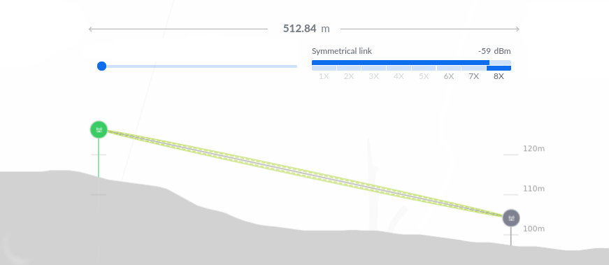 Таким образом, выбор объекта исследования в 2021 году был для нас очевиден. Целью работы было построение радиоканала с использованием двух устройств CubeG-5ac60ad на рекомендованном производителем для стабильной работы расстоянии (рис.1) (в нашем случае чуть более 500 метров, хотя производитель указывает до 800), количественное и качественное исследование этого радиоканала, в том числе проверка работы резервирования.